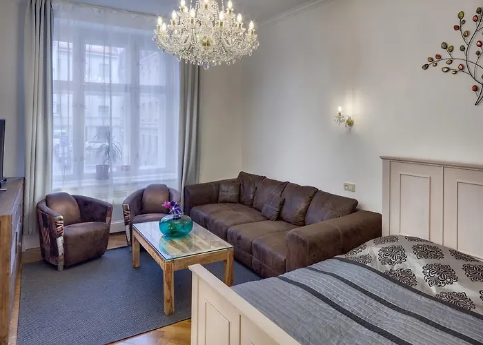 Dusni 13 - Old Town Apartment ferielejlighed udstyret med en værdiboks og bagageopbevaring, og ligger 300 meter fra Staromestska metrostation. Nærliggende populære seværdigheder omfatter Karlsbroen Den Gamle Rådhusplads henholdsvis 950 og 350 meter væk.